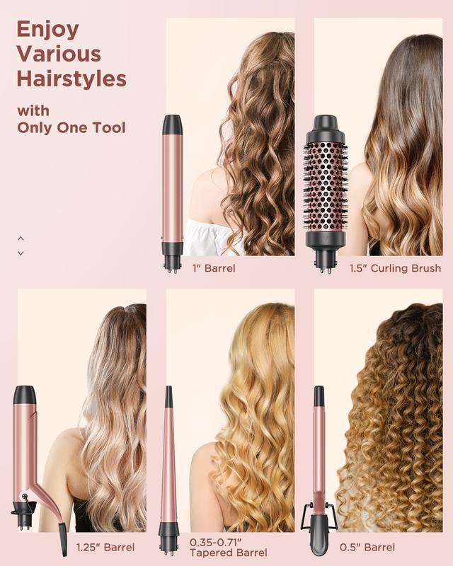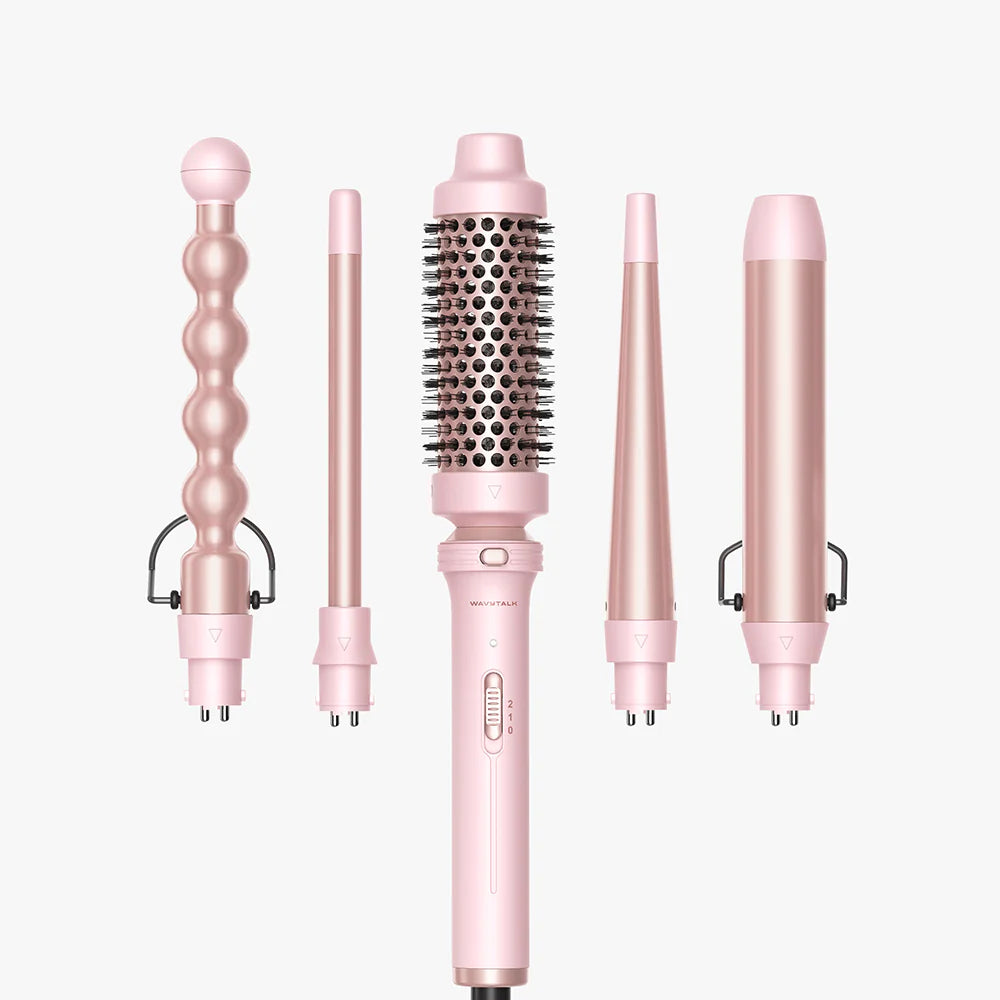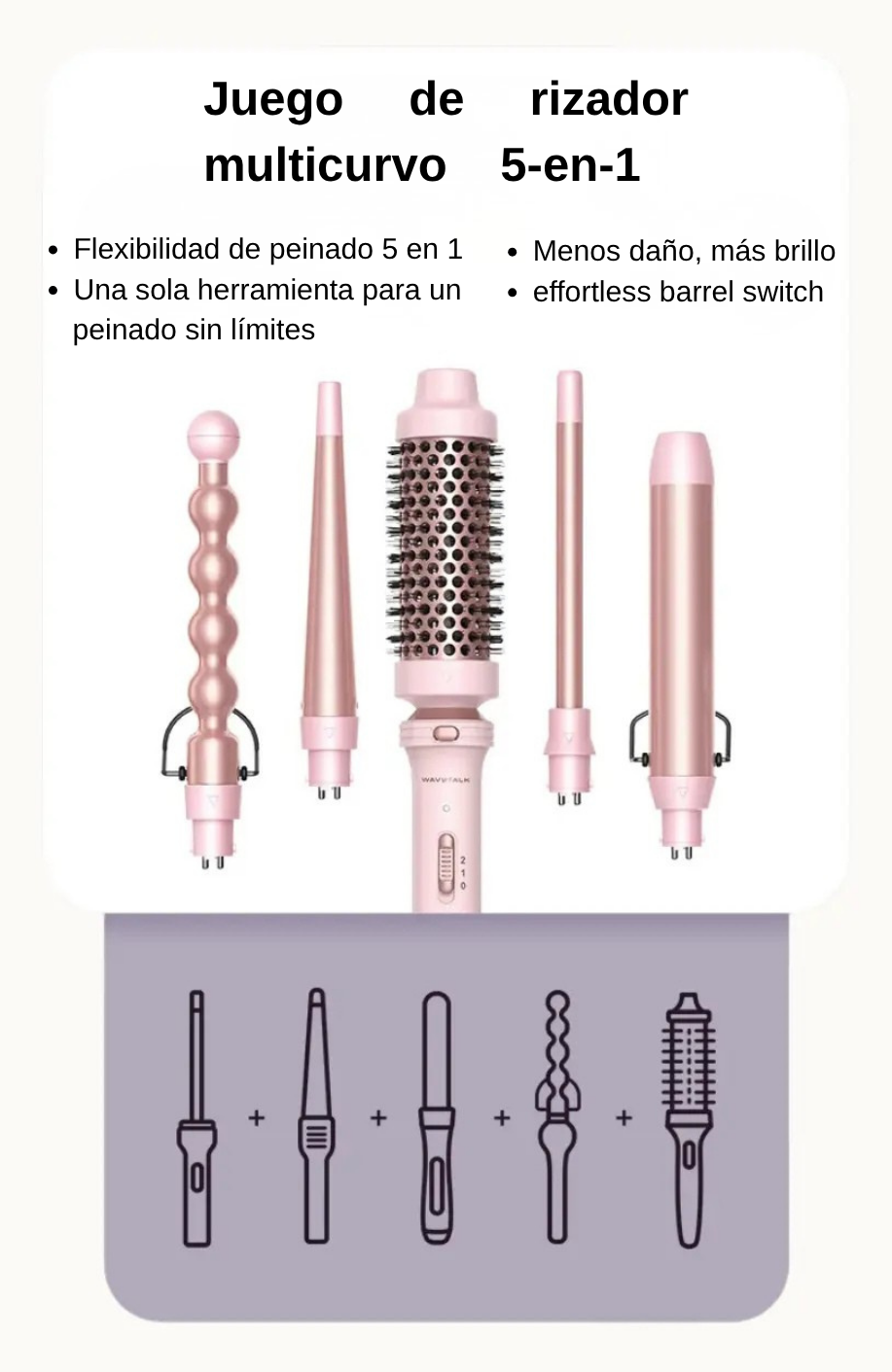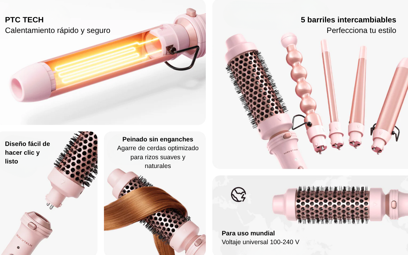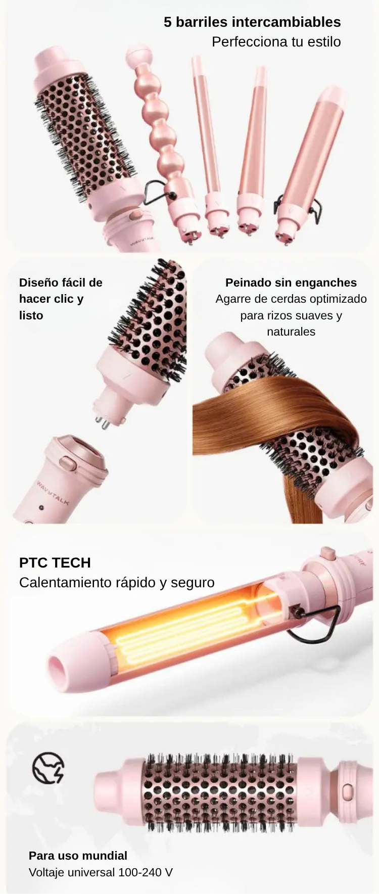 Desde rizos pequeños y definidos hasta ondas suaves y naturales. Incluye 5 accesorios: varita micro, barril cónico, barril de burbujas, varita clásica y cepillo térmico.